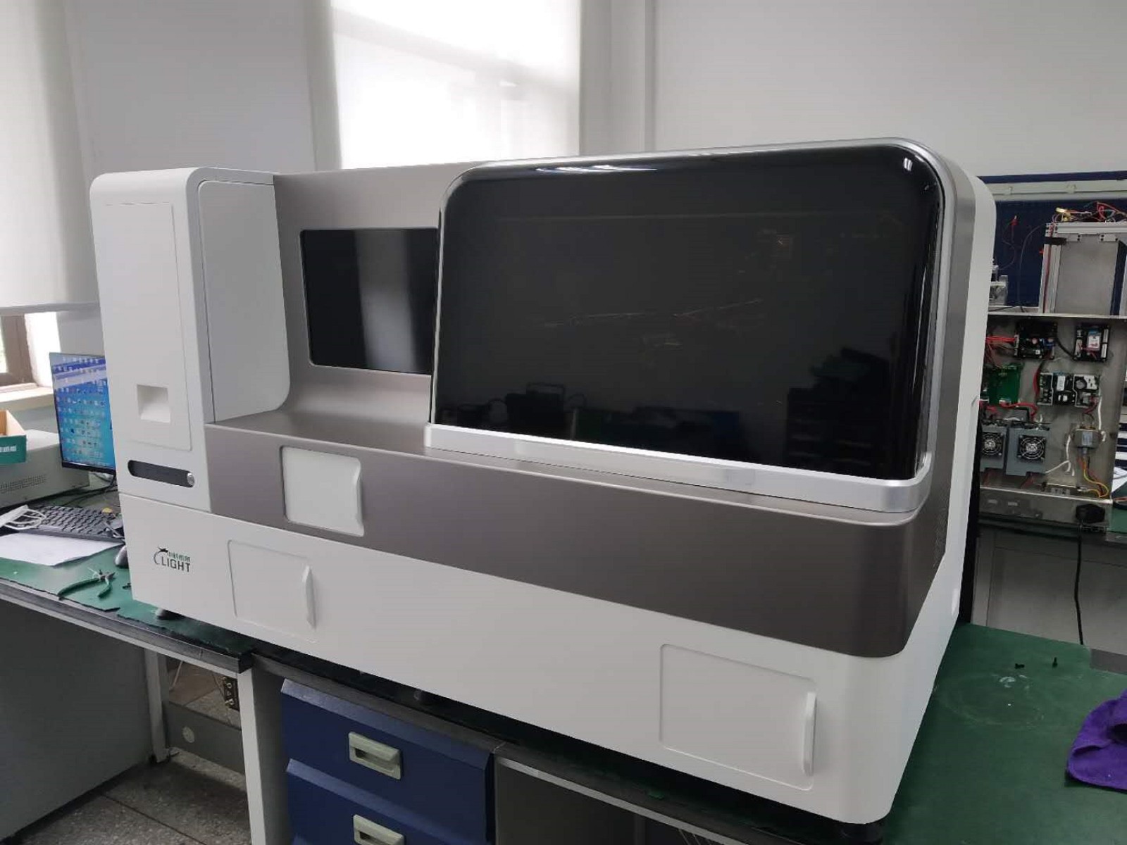 液相芯片免疫分析技術(shù)是一種以懸浮于液體中的熒光編碼微球?yàn)榉磻?yīng)載體,以流式分析技術(shù)為檢測(cè)手段,利用微量樣本實(shí)現(xiàn)多種生物分子同時(shí)檢出的新型免疫分析技術(shù)。與傳統(tǒng)檢測(cè)技術(shù)相比,液相芯片技術(shù)在通量及并行檢測(cè)程度方面優(yōu)勢(shì)明顯,同時(shí)具有較高的檢測(cè)靈敏度及動(dòng)態(tài)范圍,以及耗樣量少、特異性強(qiáng)、重復(fù)性好等優(yōu)點(diǎn)。本系統(tǒng)所用的固相反應(yīng)載體為直徑 6μm 的聚苯乙烯微球,反應(yīng)面積大,可包被的探針?lè)肿佣啵芘c樣本中的目標(biāo)分子充分結(jié)合,且反應(yīng)在液相中進(jìn)行,反應(yīng)物質(zhì)活性高,能大大增強(qiáng)檢測(cè)靈敏度。適用于癌癥指標(biāo)篩查,以胃癌指標(biāo)的定性、定量分析為主的應(yīng)用場(chǎng)景。