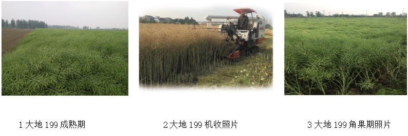 大地199是中國農業科學院油料作物研究所主持選育的高產、高油、優質、抗倒以及適應機械化收獲的油菜新品種,在長江上、中、下游地區平均全生育期分別為201.5天、209.2 天和227.5 天。平均株高157.19cm,分枝部位高度60.66cm,有效分枝數7.04 個,單株有效角果數264.33 個,每角粒數19.53 粒,千粒重4.51g。2014-2015年度在長江上游區平均畝產油量94.69 公斤,比對照南油12增產13.77%;2015-2016年度在長江中游區平均畝產154.12公斤,比對照華油雜12增產10.54%;2014-2016年度國家長江下游區試中,產量和含油量連續兩年均居參試品種第1位,兩年平均畝產191.09公斤,比對照秦優10號增產10.6%,兩年平均含油量48.67%。抗倒性強,抗病性好,適宜機械化收獲。與傳統品種相比,每畝新增經濟效益60元以上,已在長江流域大面積推廣應用,應用前景廣闊。