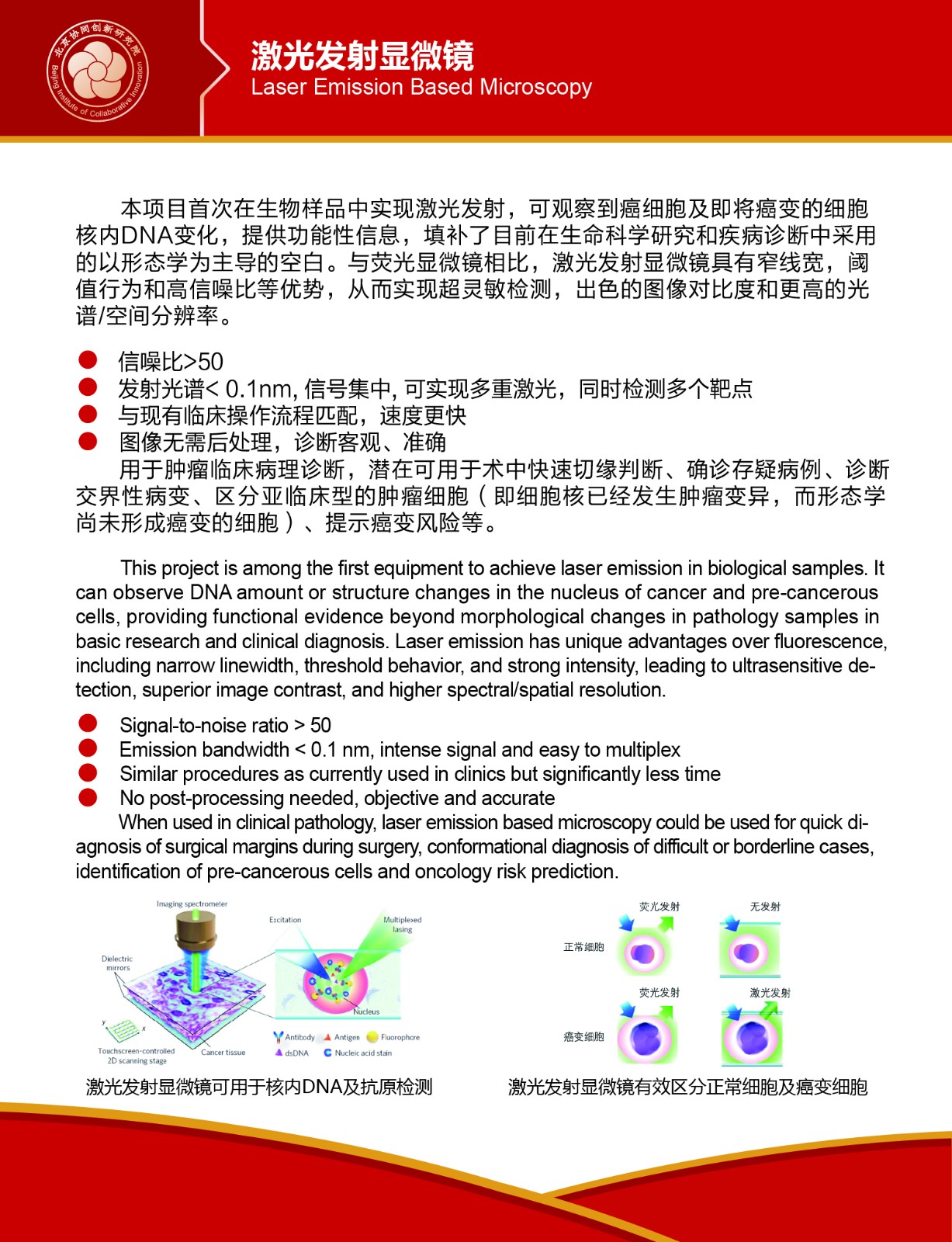 課題研制開發(fā)的用于臨床病理的激光發(fā)射多模態(tài)顯微成像系統(tǒng),采用國(guó)際領(lǐng)先的激光發(fā)射病理顯微成像(Laser Emission Microscopy, LEM)技術(shù)和多模態(tài)形態(tài)學(xué)深度結(jié)構(gòu)學(xué)習(xí)算法,能夠?qū)崿F(xiàn)高靈敏度、高通量、可量化的病理快速診斷分析和癌癥早期診斷。與現(xiàn)有的蘇木素-伊紅(HE)和巴氏等組織細(xì)胞病理酸堿染色方法以及IHC免疫組化病理診斷方法相比,本系統(tǒng)創(chuàng)新性的從激光發(fā)射成像模態(tài)定量觀測(cè)腫瘤的早期改變,實(shí)現(xiàn)細(xì)胞核DNA級(jí)別的癌癥風(fēng)險(xiǎn)預(yù)警;同時(shí),與智能病理診斷趨勢(shì)下市面上主流病理AI算法相比,本系統(tǒng)的深度結(jié)構(gòu)學(xué)習(xí)算法結(jié)合了激光發(fā)射等多模態(tài)量化表征,針對(duì)性解決了傳統(tǒng)酸堿染料染色成像因人工和設(shè)備差異造成識(shí)別不準(zhǔn)的難題。技術(shù)具備獨(dú)創(chuàng)性和國(guó)際領(lǐng)先性,對(duì)提升我國(guó)乃至全世界的智能病理診斷水平具有戰(zhàn)略意義。