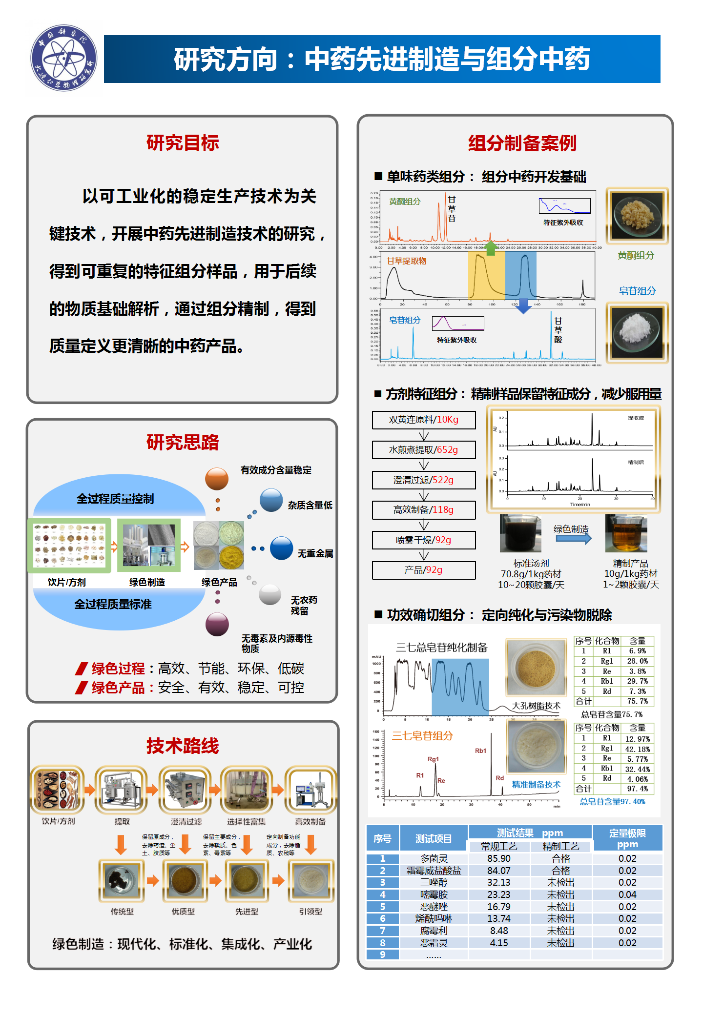 以可工業(yè)化的穩(wěn)定生產(chǎn)技術(shù)為關(guān)鍵技術(shù),開展中藥先進(jìn)制造技術(shù)的研究,得到可重復(fù)的特征組分樣品,用于后續(xù)的物質(zhì)基礎(chǔ)解析,通過組分精制,得到質(zhì)量定義更清晰的中藥產(chǎn)品。
