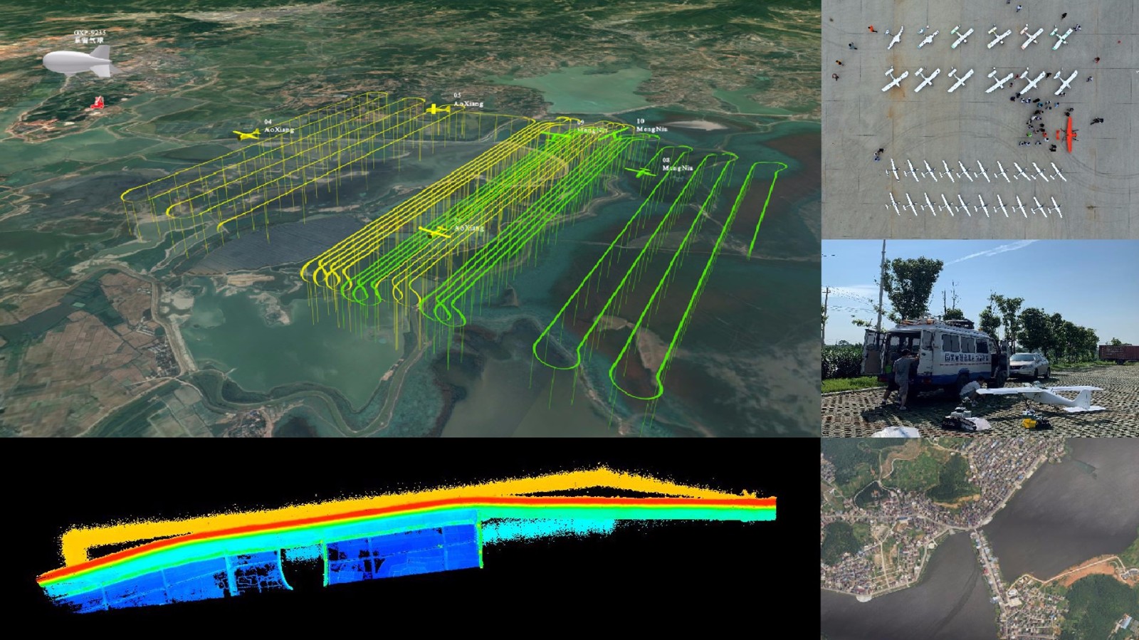 翱翔系列遙感無(wú)人機(jī)集群組網(wǎng)觀測(cè)系統(tǒng),依托國(guó)家“十三五”重點(diǎn)研發(fā)計(jì)劃項(xiàng)目: “高頻次迅捷無(wú)人航空器區(qū)域組網(wǎng)遙感觀測(cè)技術(shù)”,面向洪澇災(zāi)害、生態(tài)環(huán)境、國(guó)土安全等應(yīng)急與常態(tài)化服務(wù)需求,于2017年7月開(kāi)始研制。該系統(tǒng)構(gòu)建了具備全國(guó)土覆蓋技術(shù)能力的輕小型無(wú)人航空器區(qū)域組網(wǎng)遙感觀測(cè)體系,通過(guò)協(xié)同觀測(cè)開(kāi)展面向國(guó)家重大需求的應(yīng)用示范。系統(tǒng)以翱翔固定翼無(wú)人機(jī)為平臺(tái),其中具備任務(wù)載荷5公斤、航時(shí)2小時(shí)、時(shí)速90公里的飛行能力,可搭載大視場(chǎng)立體測(cè)繪相機(jī)、輕型雙波段視頻吊艙、MiniSAR、高光譜相機(jī)、多光譜相機(jī)、偏振相機(jī)、簡(jiǎn)單光學(xué)相機(jī)等任務(wù)載荷,具有多機(jī)組網(wǎng)協(xié)同觀測(cè)、短時(shí)間大范圍覆蓋、小時(shí)級(jí)高頻迅捷出航作業(yè)、任務(wù)載荷即插即用、不同載荷快速換裝、臨場(chǎng)和遠(yuǎn)程實(shí)時(shí)管控、遠(yuǎn)程高帶寬通信等特點(diǎn)。