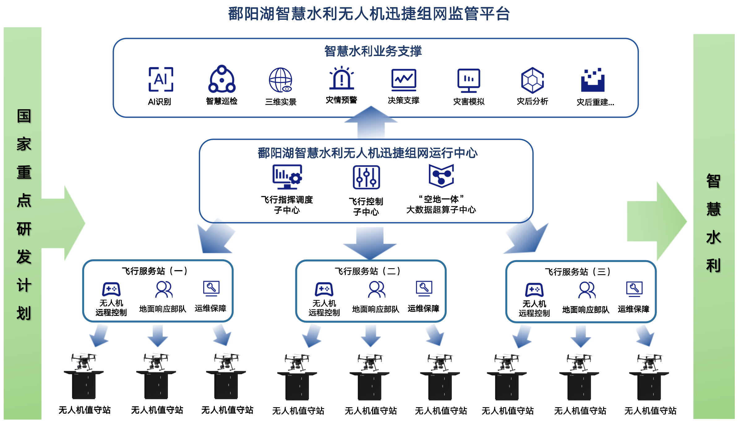 鄱陽湖智慧水利無人機(jī)迅捷組網(wǎng)監(jiān)管平臺(tái)總體建設(shè)目標(biāo)為“一中心、三飛服、百終端”,以國家重點(diǎn)研發(fā)計(jì)劃項(xiàng)目“高頻次迅捷無人航空器區(qū)域組網(wǎng)遙感觀測技術(shù)”為依托,針對鄱陽湖區(qū)域,借助大數(shù)據(jù)、云端綜合管控、空間信息快速處理、人工智能、物聯(lián)網(wǎng)、無人機(jī)遙感、遠(yuǎn)程控制和5G等高新技術(shù),依托無人值守方艙、垂直起降固定翼無人機(jī)快速機(jī)動(dòng)組網(wǎng)裝置等自研裝置,利用無人機(jī)迅捷組網(wǎng)巡航監(jiān)測手段,結(jié)合防務(wù)云實(shí)現(xiàn)一對多、多對多協(xié)同應(yīng)急響應(yīng),構(gòu)建鄱陽湖“空地一體化”監(jiān)管服務(wù)體系;全面提升鄱陽湖多維度感知能力、基礎(chǔ)設(shè)施建設(shè)與運(yùn)行能力、全天候監(jiān)管能力、多級災(zāi)害應(yīng)急響應(yīng)能力、多場景創(chuàng)新應(yīng)用能力,實(shí)現(xiàn)“天-小時(shí)-分鐘”三種時(shí)間尺度下泛鄱陽湖區(qū)域生態(tài)環(huán)境常態(tài)化監(jiān)測,鄱陽湖水文水資源綜合監(jiān)管以及區(qū)域洪澇應(yīng)急監(jiān)測,提供晝夜堤岸動(dòng)態(tài)、隱患排查、潰堤監(jiān)測、泄洪范圍、區(qū)域救援態(tài)勢等技術(shù)手段和能力,推動(dòng)鄱陽湖智慧水利、防洪減災(zāi)、生態(tài)保護(hù)等的一體化監(jiān)管。